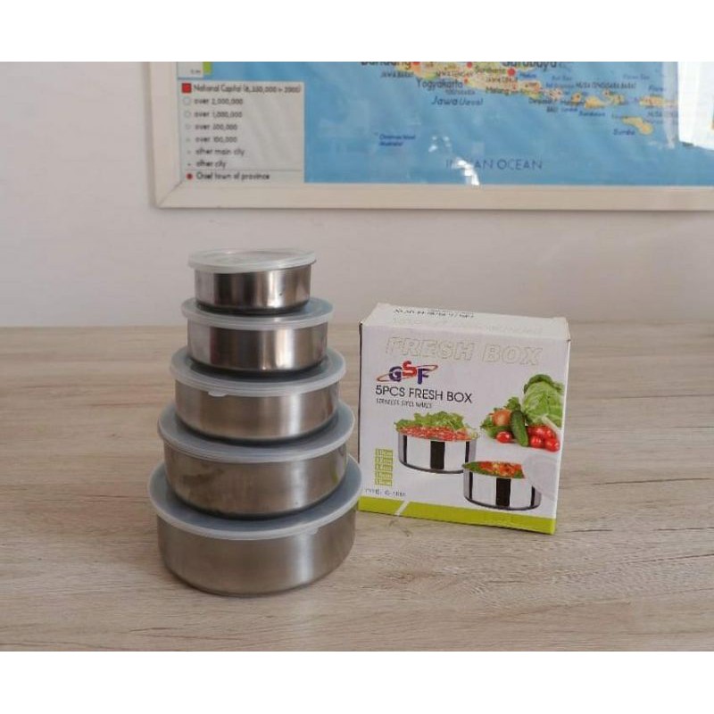 Rantang Stainless / Fresh Box 5 Susun (5 In 1) Tempat Penyimpanan Nasi,Sayur, Lauk Pauk, buah2an dsb.Ukuran:10cm/12cm/14cm/16cm/18cmPanci satu set disertai tutupBahan stainless steel anti karat dan tahan panas.Dilengkapi tutup plastik tebal.Bisa digunakan untuk menyimpan makanan berkuah/kering,adonan kue,nasi,lauk pauk dll..Bisa jg untuk dipanaskan diatas kompor dgn api kecil.Praktis krn menyimpan atau membawanya disusun saja..Tdk butuh ruang banyak untuk hasil maximalBerat 6