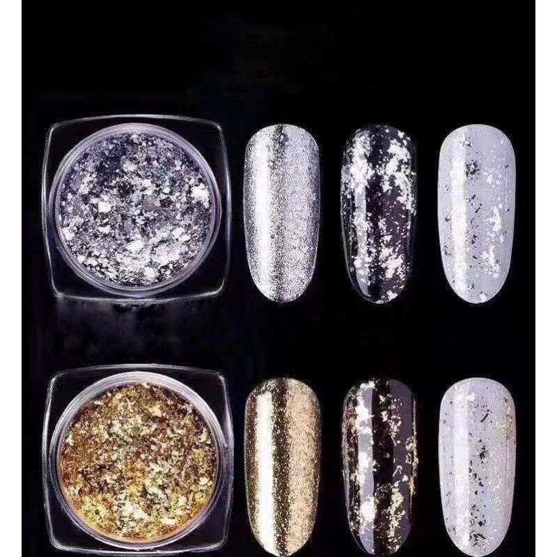 FOIL CUT ACCESORIESFoil Cut Aksesoris set. 1 pack terdapat 2 jar warna silver dan gold. Foil ini sudah berupa potongan kecil kecil sehingga tidak perlu di potong, langsung pakai