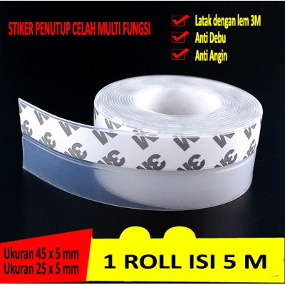 Penutup Celah Lemari, Strip Segel Pintu dan Jendela Kedap Suara Warna Transparan, Weather Stripping, Under Door Draft Blocker Seal, Door Seal Strip WeatherproofPintu lemari ataupun daun pintu rumah anda mempunyai celah yang lebar menyebakan masuk debu dan angin dari luar, atasi masalah dengan menggunakan produk kami : Penutup celah lemarin dan pintu Keunggulan Produk :- Berbuah dari bahan latex sehigga tidak mudah berubah bentuk dan elastis- Dengan lem 3 m memastikan daya lekat yang kuat dan tidak gampang copot- Mudah pemasangannya- Tersedia dalam 2 ukuran ( 45mm/25 mm) cocok untuk semua celah pintu anda- 1 roll berisi 5 mSpesifikasi produk- Nama : Tempelan Celah lemarin dan pintu- Bahan : Latex alami + lem 3m- Ukuran : 45 mm x 5 m / 25 mm x 5 m- Ketebalan : stiker 3 m 1.2 mm / latex 1.0 mmNote : Minimal Order 5 me