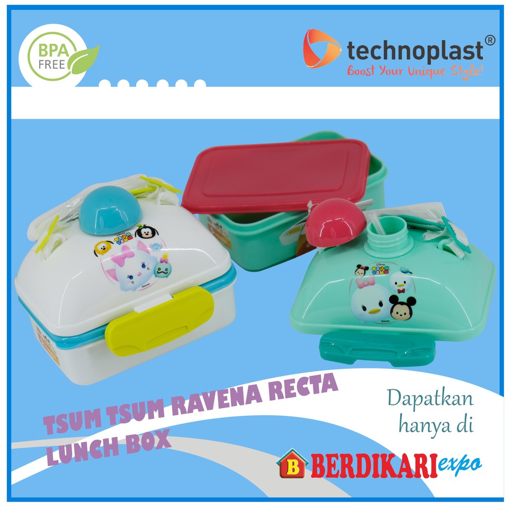 TSUM TSUM RAVENA RECTA LUNCH BOX, salah satu koleksi Tsum-tsum dari Technoplast yang sangat multifungsi. Karena, tidak hanya menampung bekal, tapi juga bisa menyimpan air minum untuk si kecil. Jadi, apabila si kecil merasa tidak nyaman dengan membawa botol minum dan tempat makan untuk bekalnya disekolah nanti, kamu bisa memiliki Linch box ini. Botol minum ditandai dengan tutup Lunch Box yang berbentuk bulat. sedangkan tempat makan ditandai dengan segel kiri dan kanan yang melekat. 2 wadah bekal digabung menjadi 1 lunch box, praktis bukan?KODE PRODUK:LB101.DT18/48PPRODUCT DIMENSION:154 x 131 x 130 mmMAJORITY PRODUCT MATERIAL:PPWEIGHT:196.84CARE AND USAGE INSTRUCTIONS"PERAWATAN KOTAK MAKAN ANDA"-Tutup rapat saat bepergian-Isi sesuai takaran-Simpan di tempat teduh-Aman untuk dihangatkan di dalam microwave sampai dengan 100?C,dengan tutup terbuka-Cuci Sebelum digunakan"LANGKAH MENCUCI"-Gunakan spons halus , air dan sabun untuk mencuci wadah.-Biarkan tutup wadah terbuka hingga kering.-Taruh wadah dalam posisi terbalik sampai kering.Hindari sikat / spons kawat dan detergent k