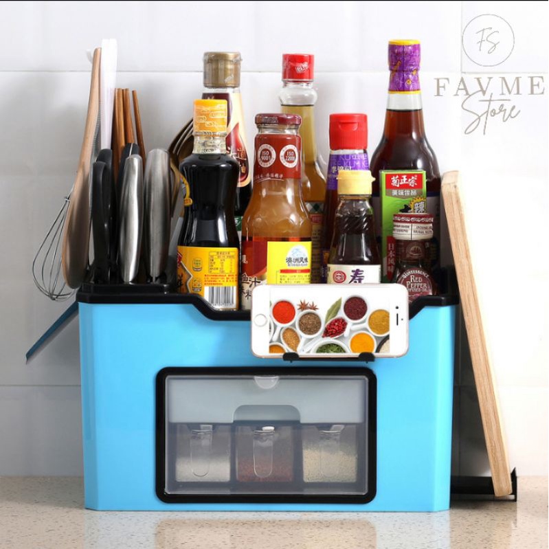 Keunggulan Produk :- Kapasitas Besar dan mempunyai banyak slot - Multifungsi, selain untuk taruh bumbu juga bisa untuk tempat peralatan dapur seperti, pisau, gunting, sendok, sumpit, centong untuk masak dll- Pada bagian atas juga terdapat slot besar untuk tempat botol-botol saus, minyak dll- Pada bagian depan terdapat 6 laci untuk bumbu masak seperti: gula, garam, merica dll- Dilengkapi kait gantungan untuk menggantung peralatan masak - Mudah dibersihkan - Extra Space untuk HP dibagian paling depan, mempermudah untuk menonton video memasak atau mendengarkan music. - Bagian bawah juga terdapat rongga untuk akses alir mengalir sehingga rak tetap kering, anti-bakteriUkuran Produk : 39.5 x 20 x