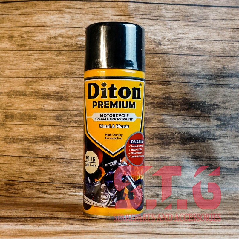 DITON PREMIUM adalah cat semprot bermutu tinggi yang diformulasikan khusus untuk kendaraan bermotor. cepat kering, tahan bensin, tidak retak dan lebih mengkilap. Diton Premium sudah mengadopsi sistem pada spray gun yang menghasilkan hasil semprotan seperti kipas tidak seperti cat semprot pada umumnya.DITON PREMIUM memberikan ratusan pilihan warna. Warna solid, metallic, candy tone, warna mutiara, fluorescent dan warna logam.DITON PREMIUM memberikan jaminan cat tahan lama, tahan bensin, anti-retak, cepat kering, dan hasil cat yang lebih mengkilap. Keunggulan Cat Diton:1. DITON PREMIUM berbahan dasar thermo plastic acrylic dengan daya lekat yang sangat kuat dan sangat elastis, sehingga dapat disemprotkan pada benda berbahan logam, kayu maupun plastik.2. Warna-warna metalic DITON PREMIUM sangat cocok dan mendekati warna yang digunakan pada semua merek dan jenis kendaraan bermotor dengan hasil akhir Super High Gloss.3. Untuk menghasilkan warna yang sempurna harus lapiskan terlebih dahulu warna DITON PREMIUM White 9102 atau DITON PREMIUM SILVER 9124 sebagai warna dasar. Dan untuk hasil lebih kilap harus dilapisi dengan DITON PREMIUM CLEAR 9128.Harga tertera untuk 1 kaleng cat DITON PREMIUM ukuran 400 cc sesuai deskripsi warna.BELI BANYAK LEBIH MURAH DAN HEMAT ONGKIR!Harga Grosir Mulai Pembelian 2 Pcs!Pelanggan mohon baca Catatan Penjual dan Kebijakan Pengembalian Barang kami.Stock produk banyak, siap dikirim ke seluruh Indonesia.Ingin jadi reseller dengan harga khusus? Silakan chat/ PM.Terbuka untuk yang mau dropship juga.Silakan chat/ PM atau ke kolom diskusi jika ada pertanyaan.PENTING:Jadikan steGO toko favorit Anda agar terus terupdate dengan produk terbaru