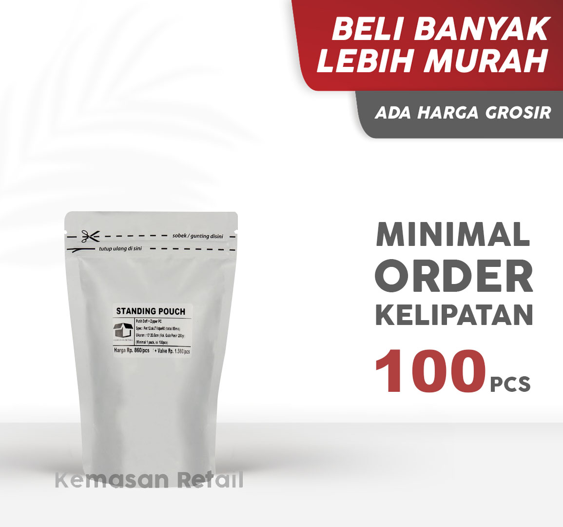 MOHON DI PERHATIKAN:MINIMUM ORDER:KELIPATAN 100 PCSSpesifikasi Produk:Jenis = Stand Up Pouch / Standing PouchIsi = 100 pcs/packSpesifikasi : Pet12/Alu7/lldpe50Ketebalan : 75micronTersedia berbagai jenis ukuran:- 9cm x 15cm (untuk acuan gula pasir 150g, acuan kopi 70g)- 13cm x 20.5cm (untuk acuan gula pasir 250g, acuan kopi 150g)- 14cm x 23cm (untuk acuan gula pasir 500g, acuan kopi 250g)- 18cm x 29cm (untuk acuan gula pasir 1100g, acuan kopi 600g)Note:- Barang yang sudah di beli tidak dapat di kembalikan atau ditukar. Mohon untukdi pastikan ukuran yang anda pilih.Terima kasih telah berbelanja di toko kami.“From KJG With