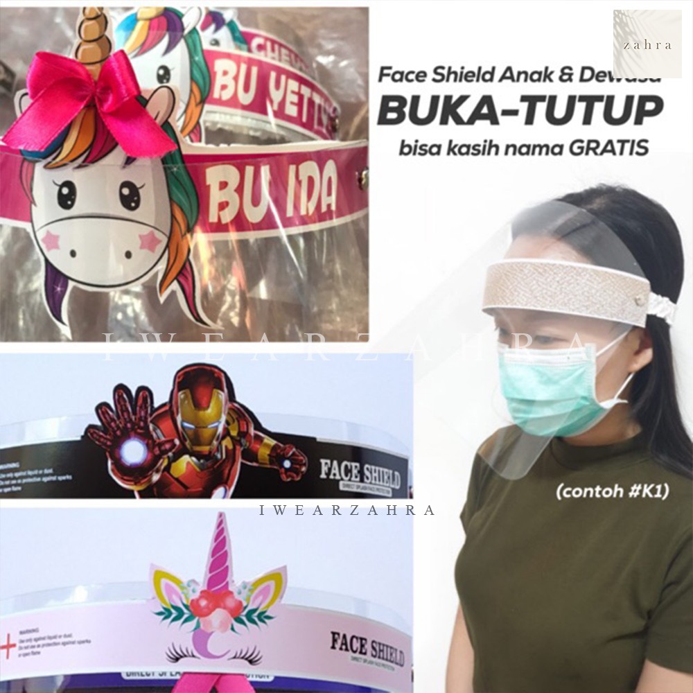 PELINDUNG WAJAH- bisa buka tutup- bisa untuk bayi, anak, hingga dewasa- minimal pembelian 2pcsKUALITAS TINGGI- tebal mika 0.4mm (seller lain biasanya 0.3mm)- free packaging aman (kardus + penyumpal) CUSTOM NAMA- bisa langsung checkout, tulis nama di notes- PO super cepat 1 hari jadiREADY SEMUA, LANGSUNG CHECKOUT- semua karakter ready banyak setiap hari- silahkan di checkout langsung MELAYANI GROSIR- pembelian grosir bisa hubungi kami untuk harga spesial- welcome reseller & dropsh