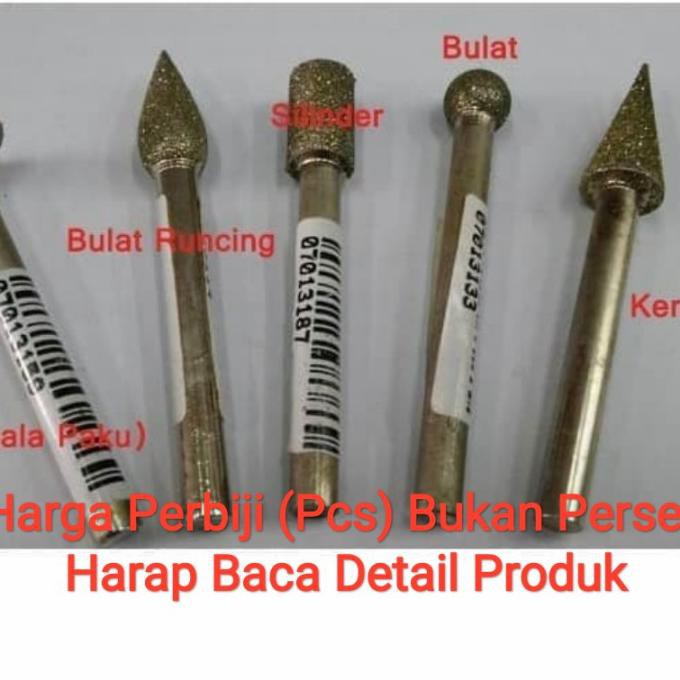 Ready stock kak,,,silahkan order !!!! keburu habisss...Mata Grafir untuk grafir(ukir) batu granit/marmerBisa digunakan di Mesin GrafirTerdapat 5 bentuk Mata Grafir yaitu :Bulat, Bulat Runcing, KP (Kepala Paku), Silinder, dan KerucutMasing masing bentuk memiliki ukuran tersedia sebagai berikut contoh : Bulat 4 - 3 (lebar 4mm, batang diameter 3 mm)Bulat :4 - 36 - 36 - 68 - 610 - 612 - 6Bulat Runcing :3 - 34 - 35 - 36 - 36 - 68 - 610 - 6KP (Kepala Paku) :10 - 310 - 612 - 614 - 616 - 618 - 620 - 6Silinder :5 - 36 - 38 - 610 - 612 - 6Kerucut :3 - 36 - 68 - 610 - 612 - 6Note :Produk ini dijual persatuan (pcs) bukan per set Pembelian boleh dimix (dicampur) ukurannyaMohon ditanyakan ketersediaan stok terlebih dahulu sebelum membeli!! CANTUMKAN JENIS DAN UKURAN DI KOLOM KETERANGAN, JIKA TIDAK DICANTUMKAN PESANAN DIPROSES RANDO
