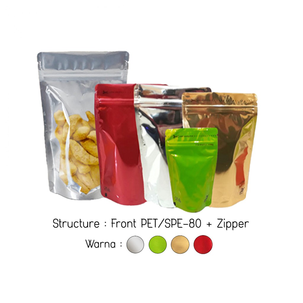 **mohon tanya stok ya****harga diatas adalag hrg per 1 lembarSpesifikasi :Model : Standing PouchDapat berdiriBahan super aluminium foil warnaDipadu bagian depan transparan.Foodgrade aman untuk makananPilihan warna :1. Emas Gold doff2. Merah3. Hijau4. SilverDilengkapi :1. zipper/ziplock jadi tinggal klip saja.Untuk kedap udara dan Dobel aman bagian ujung bisa dipress dengan sealer (press plastik)2. Ada tanda gunting di sini3. Ada tanda foodgrade ukuran ( Lebar X Tinggi )-150 =9x15-250 = 13 x 20-500 = 14 x x23-1100 = 18