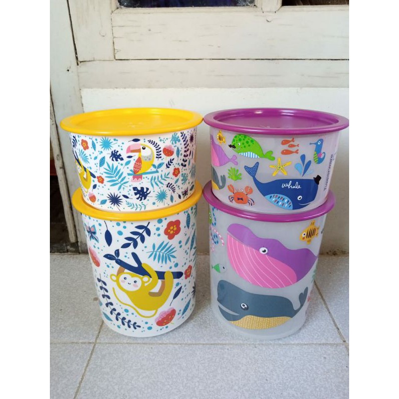 dapat digunakan sebagai toples kue, susu, tepung dllukuran 940 ml dan 2 litertutup one touch jadi cukup tekan tengah ny saja sudah