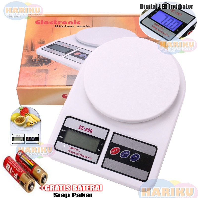FREE / GRATIS BATERAI (Siap Pakai) + Produk terPacking DUS + BUBBLE.Dapur Digital yang satu ini, cocok sekali untuk Anda yang suka masak-memasak & memerlukan keakuratan ukuran timbangan. Karena Anda tidak perlu lagi untuk memastikan jarum timbangan, apakah sudah pas atau belum.dengan menggunakan alat ini maka akan sangat memudahkan kerja anda dlm menimbang berbagai jenis bumbu,bahan,kimia,batu mulia,obat, makanan dan barang lain hanya dengan tinggal melihat saja pada display tuk mendapatkan data yang akurat dan tepat.Timbangan digital sangat cocok dipakai untuk :• Menimbang makanan, beratnya• Membantu memadukan kadar bumbu masakan dengan presisi timbangan yang akurat• Menimbang racikan obat• Timbangan berat paketan buat online shop• Menimbang bahan kue / bumbu-bumbu / sayuran.Spesifikasi Timbangan SF400 Putih:* Berteknologi "High Precission Strain Gauge” (Akurasi Per 1 Gram)* Tampilan LCD dengan angka yang besar sehingga mudah terbaca walau saat gelap.* Overload / Low battery indicator* Power: 2 x Baterai AA 1,5 volt (+FREE BATERAI)* Auto zero resetting* Ukuran : 16,5 x 24 x 3,5 cm* Kapasitas : Max 10 kgTutorial :- Siapkan wadah/ media penampung (mangkuk,gelas dll)- Letakkan timbangan pd tempat yg datar & diam- Hidupkan power timbangan hingga LCD tampil nol- Letakan wadah diatas plate bundar timbangan- Tekan cepat tombol ON Power hingga angka nol- Siap untuk menim